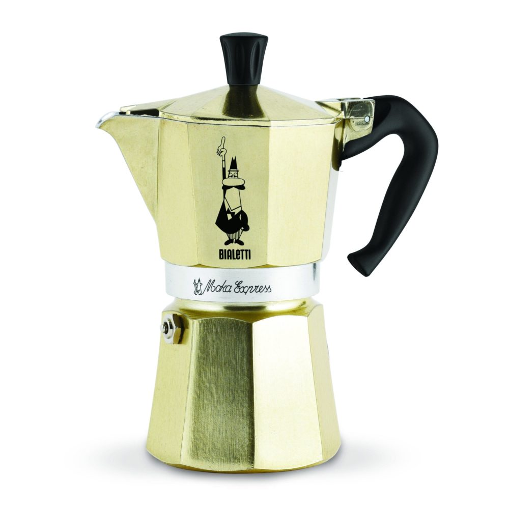 *LIMITED RELEASE* Gold Moka Express: Just like the classic Moka Express, the Gold Moka is constructed from food grade aluminium and includes a sturdy stay cool nylon handle and knob and Bialetti’s patented safety valve. Only available while stocks last.
